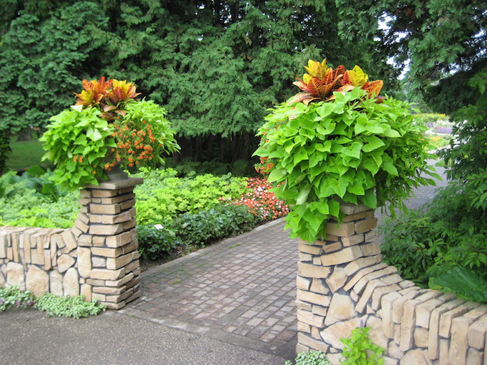 I think there is a tendency to believe that changing the look and feel of a space needs to mean drastic changes. The reality is that swapping out a single plant can make a big difference. The two combinations below both have Superbells® Grape Punch and Superbells® Miss Lilac. The only difference is that one has a dark colored sweet potato vine and the other has a chartreuse sweet potato vine. The planter with the dark colored sweet potato vine recedes on the page, while those with the chartreuse really jump out at you.