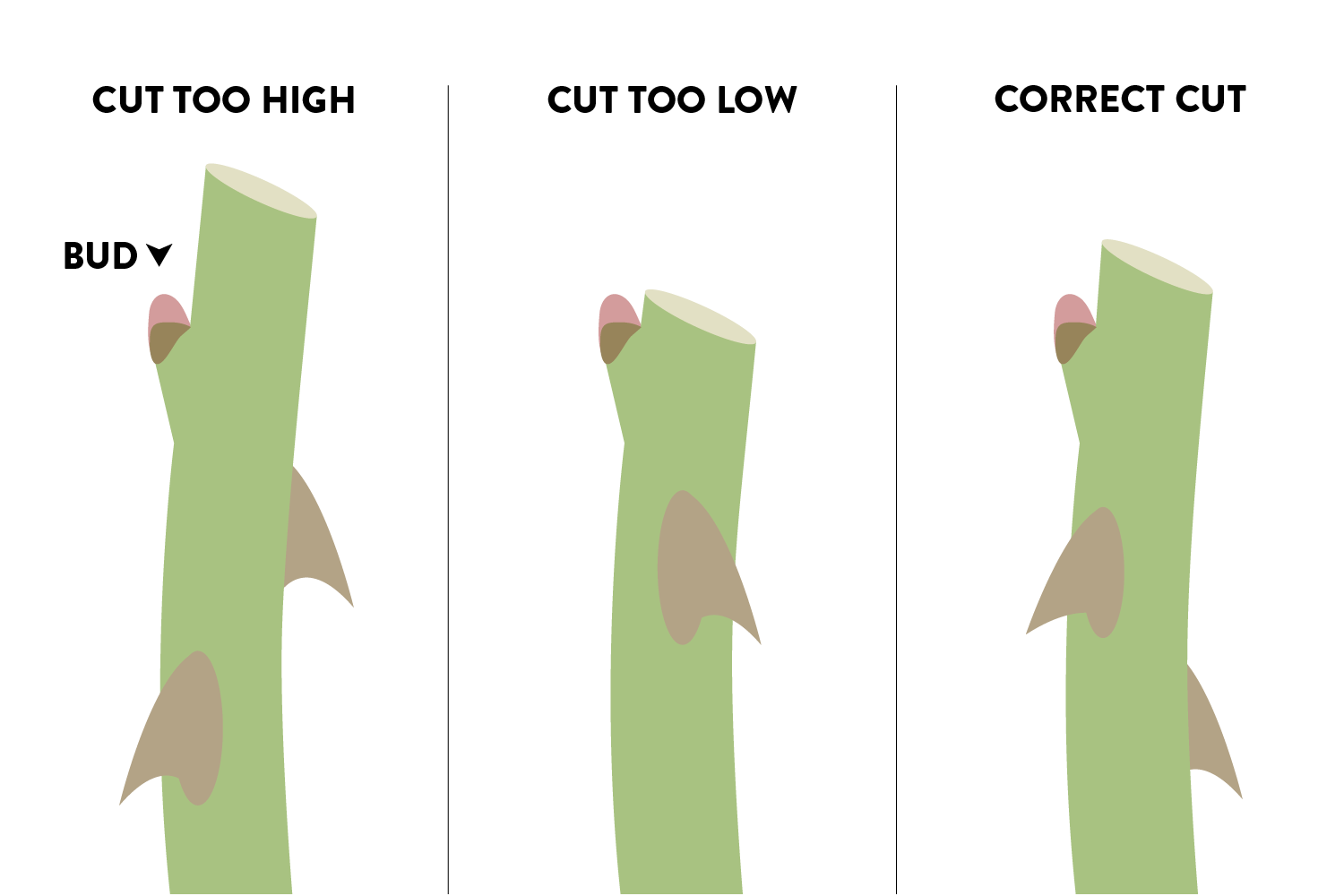 Although most Proven Winners roses don’t need to be deadheaded to rebloom, you may want to go over your plant to give it a tidier appearance. To do this, you’ll follow the stem of the spent bloom down to the first set of five leaves. Cut in a diagonal about 1/4 - 1/8” or .635 - .3175cm above the leaf. See the photo example above of a proper cut.